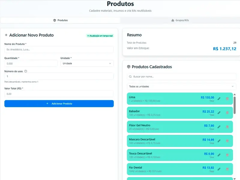 Aqui você cadastrará produtos e insumos para calcular os seus custos por procedimentos.